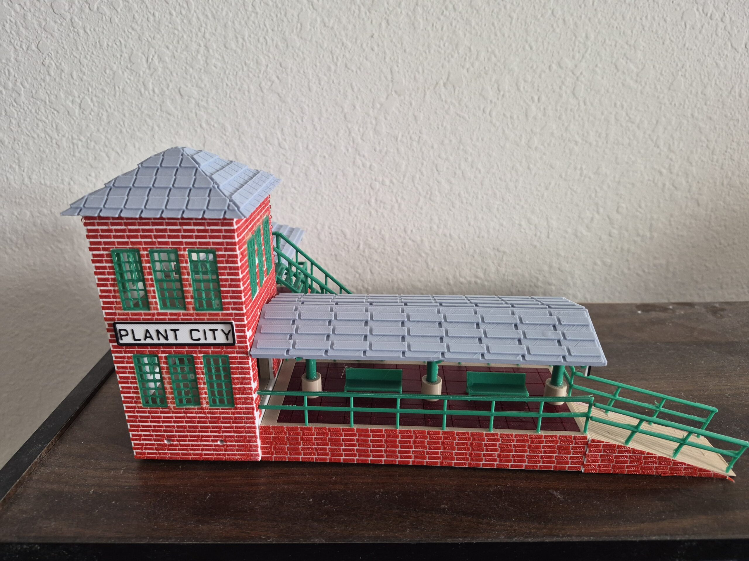 This replica of the Plant City Train Viewing Platform can be used in a model train layout, displayed on a shelf or used in a holiday village. This model is designed to be used in an HO scale train layout.