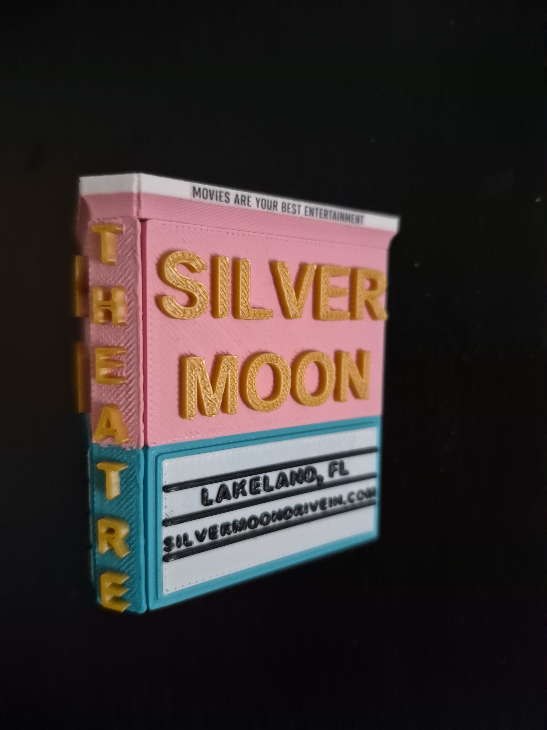 This is a replica of the marquee sign at the Silver Moon Drive-In theater. This sign is near the entrance to the drive in on New Tampa Highway in Lakeland, FL. This sign tells you what movies are playing. Now you can have a replica of this sign on your refrigerator. Perfect for anyone who has memories of visiting the drive-in or likes to collect Lakeland souvenirs.